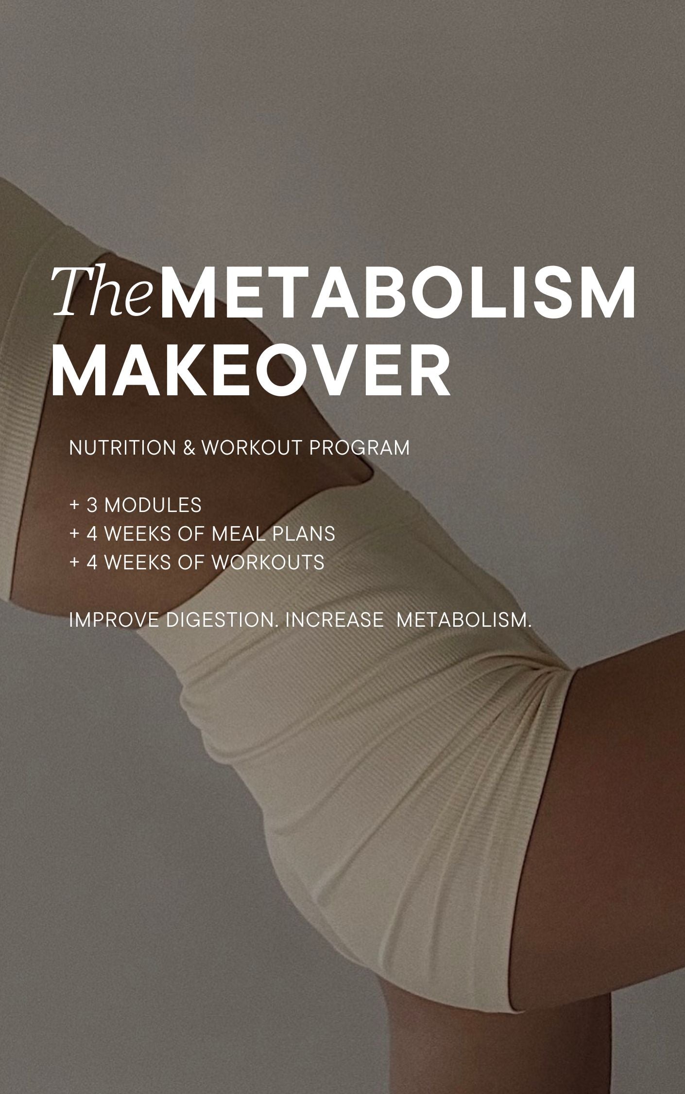 Burn fat. Increase your metabolism. Welcome to the metabolism make over program! This 30-day meal and workout plan was created to restore your metabolism so that you can achieve fat-loss results that last. By increasing your metabolism you can work smarter, not harder + actually enjoy life without all the counting, tracking, or hours spent in the gym.